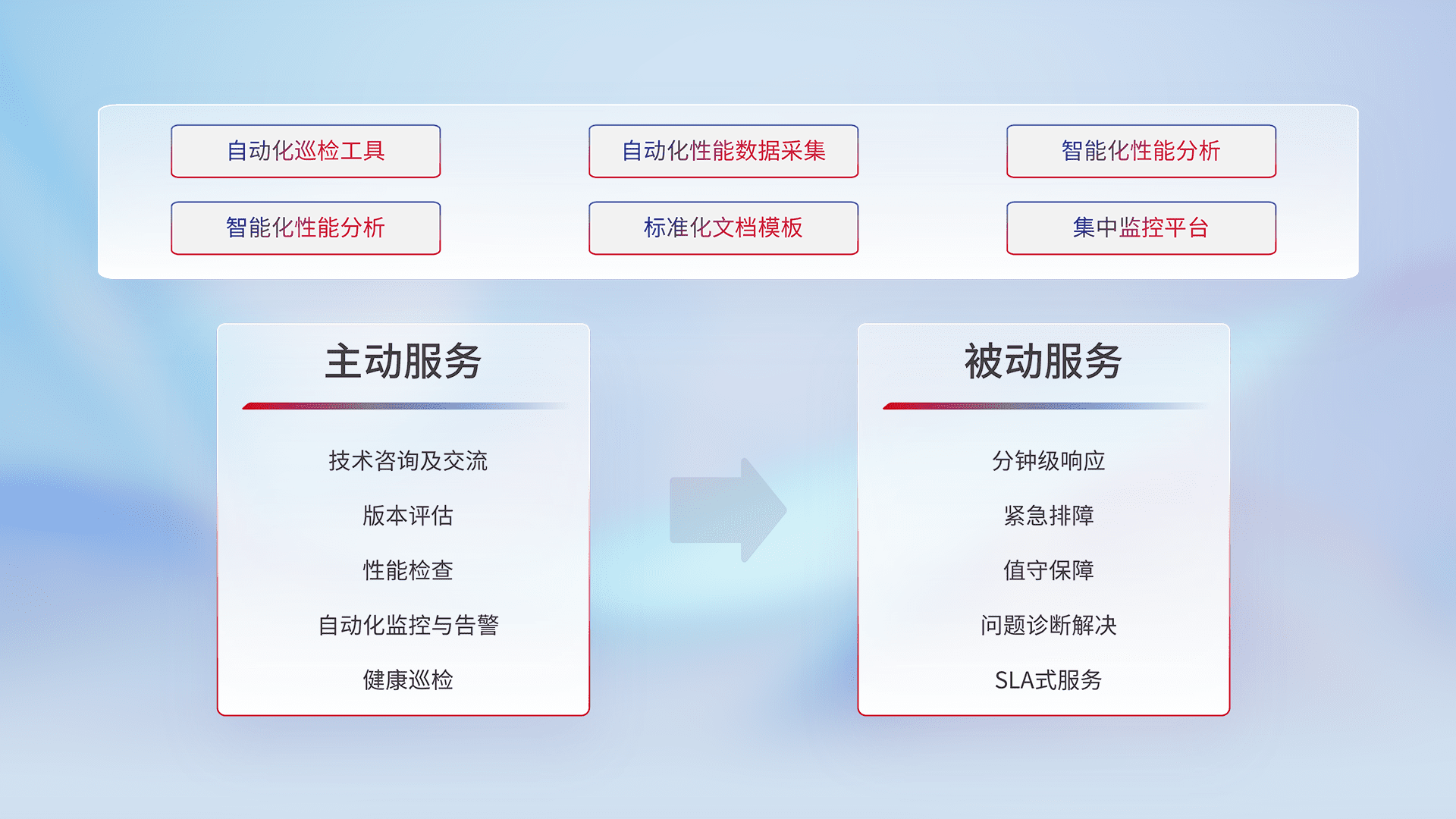 智能化工具和标准化文档,,保障服务质量,,,,提供主动服务(包含技术咨询、、、版本评估、、、性能检查、、自动化监控与告警、、、健康巡检)和被动服务包含(分钟级响应、、、、紧急排障、、、、值守保障、、、、问题诊断解决、、、、SLA服务)。。。。